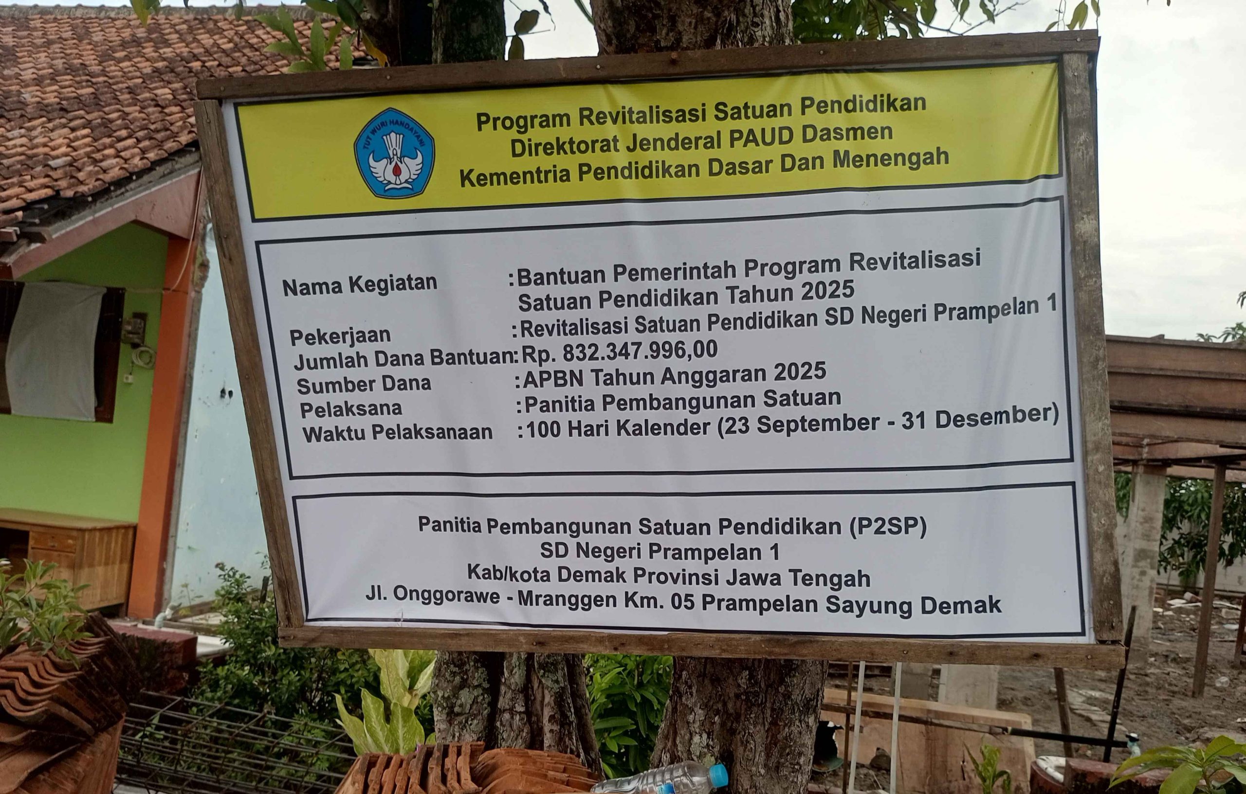 DEMAK, Hukum-kriminal.com — Aroma ganjil menyeruak dari proyek revitalisasi SDN Prampelan 1, Kecamatan Sayung, Kabupaten Demak. Bantuan pemerintah tahun anggaran 2025 senilai Rp832.347.996 yang seharusnya dilaksanakan melalui skema swakelola P2SP (Panitia Pembangunan Satuan Pendidikan) justru diduga “berpindah tangan” ke sebuah perusahaan, CV Cahaya Muda Karangawen.