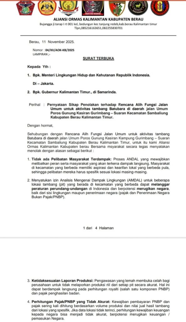 BERAU, Hukum-Kriminal.com – Aliansi organisasi masyarakat (ormas) di Kabupaten Berau, Kalimantan Timur, terus berupaya menolak rencana pengalihan jalan di sekitar Gunung Kasiran, Gurimbang, menuju pesisir Berau yang akan dilakukan oleh PT Berau Coal.